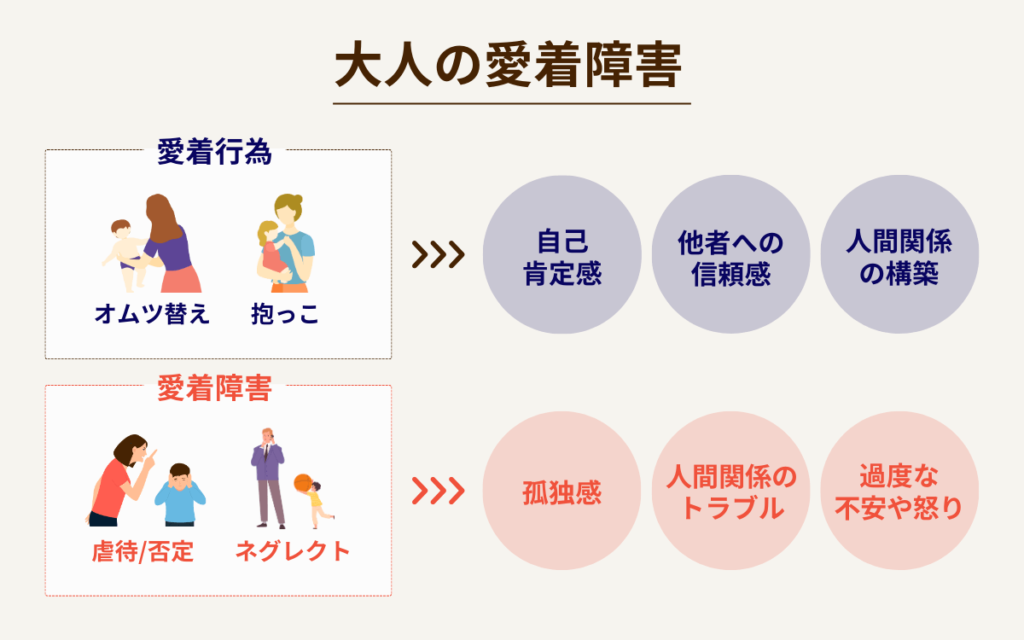 上記のような状態を養育者が放置すると「大人の愛着障害」につながります。