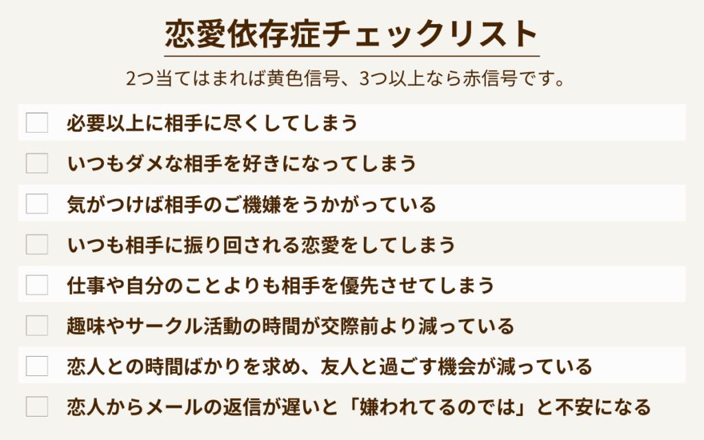 自分の存在価値を恋人にのみ求めたり、相手の行動を常に把握しようとしたりする行動は、恋愛依存症の典型的な症状です。