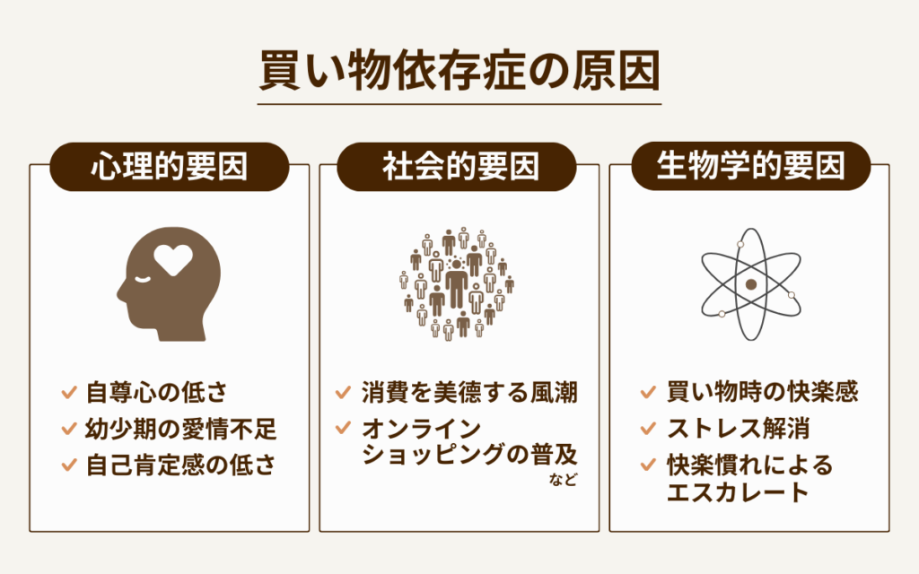 買い物依存症の原因には「心理的要因」「社会的要因」「生物学的要因」があります。詳しくみていきましょう。