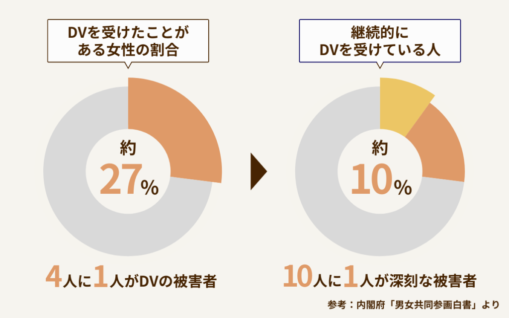 日本のデータで、男性から身体的暴力を受けたことのある女性は26.7%で、4人に1人はDVの被害経験者です。また、繰り返される継続的な暴力を受けたことのある女性は10%程度いるとされ、10人に1人は深刻な被害にあっています。